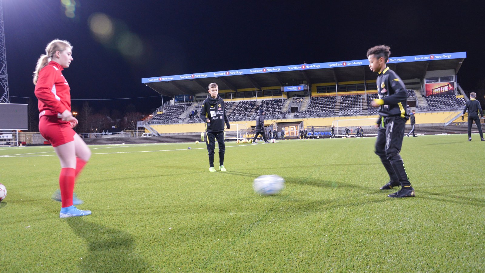 Aspmyra stadion er fast treningsarena for lagene i Glimt-akademiet. Noa og Kvame på Glimts G13-lag liker det, selv om Noa er så glad i fotball at han også konker på garasjeveggen hjemme.