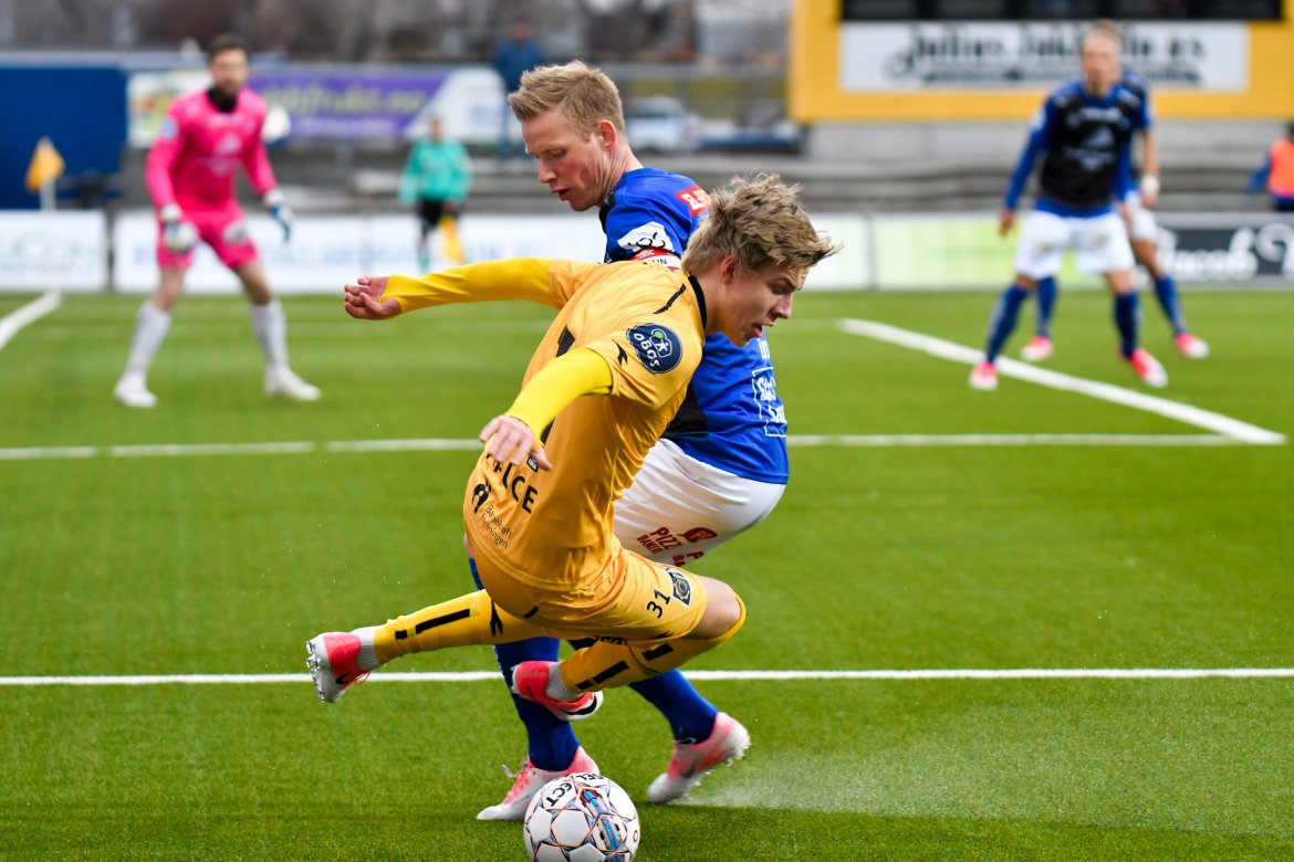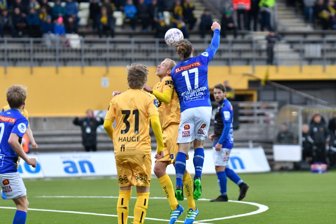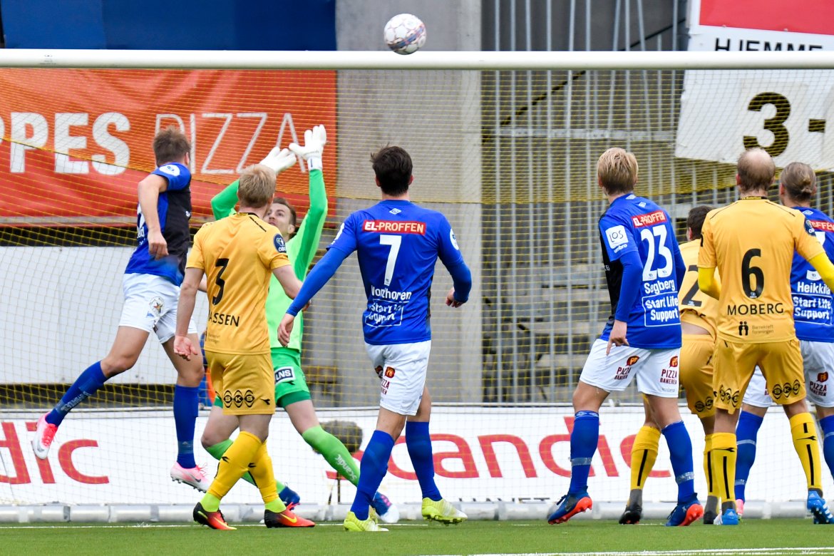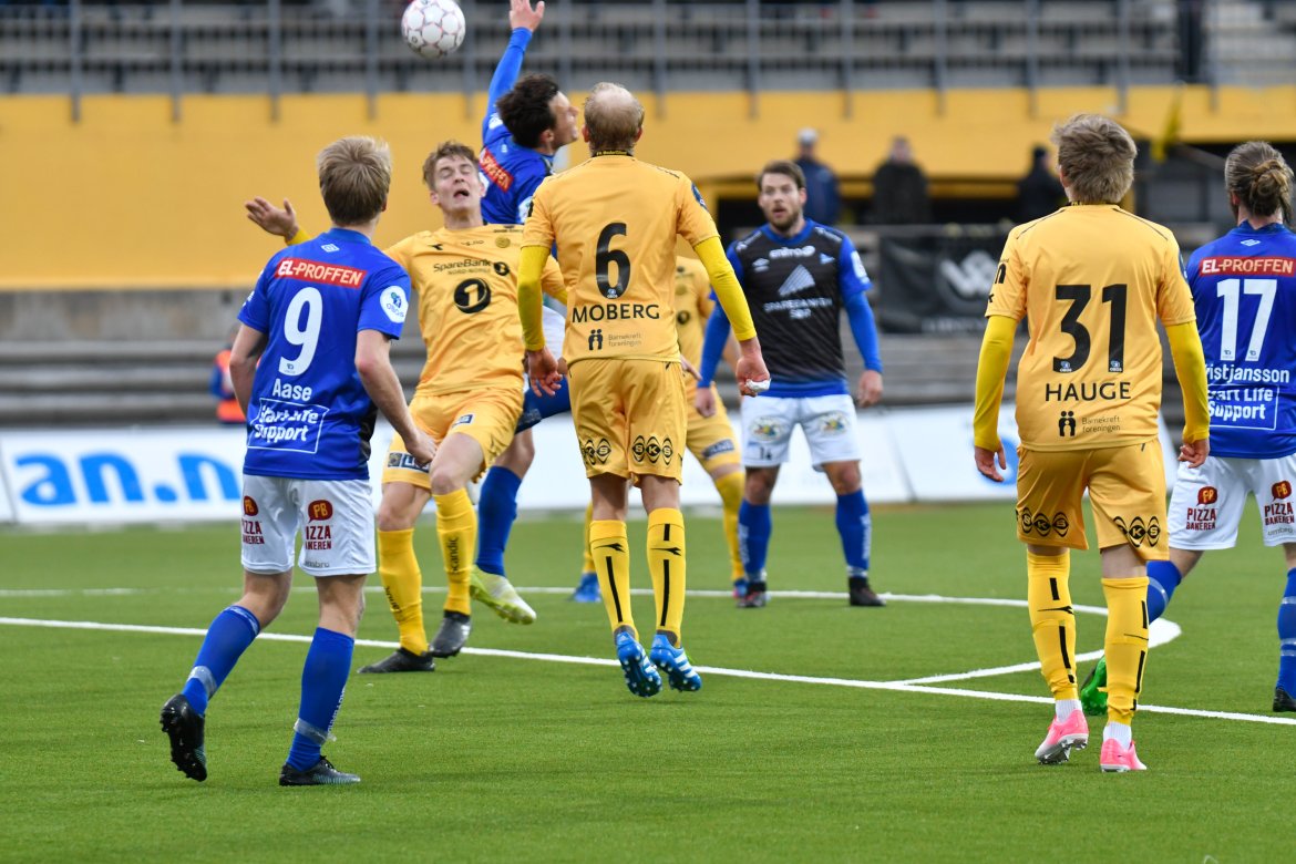 De to lagene var farlig frempå de første minuttene, og kampen bølget frem og tilbake i åpningen. Det virket som at ingen av lagene klarte å få hull på byllen, men etter 25 spilte minutter satt den endelig for Moberg og Glimt. Den høyreiste nykommeren steg opp på bakerste stolpe, og dunket inn ledermålet til hjemmelaget. Dermed 1-0 til Glimt. Samme mann skulle komme i fokus nok en gang, da de helgule fikk corner drøye ti minutter senere. Ballen ble lempet på bakerste, og også her raget Moberg høyest og fikk kriget ballen inn bak en utspilt Håkon Opdal. 2-0 til Glimt. Lagene gikk dermed til pause med en solid ledelse til hjemmelaget.