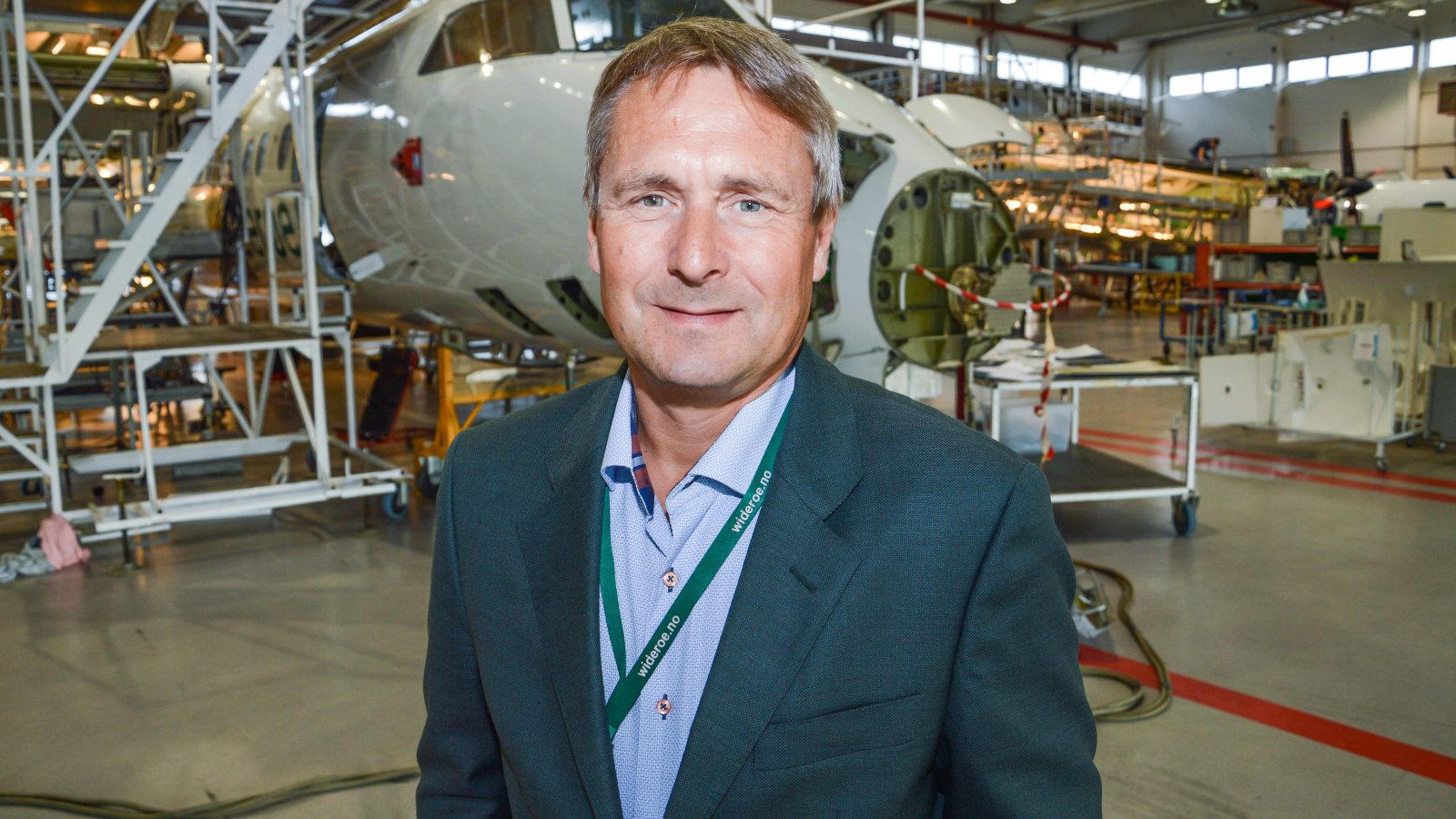 Administrerende direktør Stein Nilsen står i hangaren til Widerøe Flyveselskap AS på Langstranda i Bodø. Rundt ham står fly som nærmer seg pensjonsalderen.