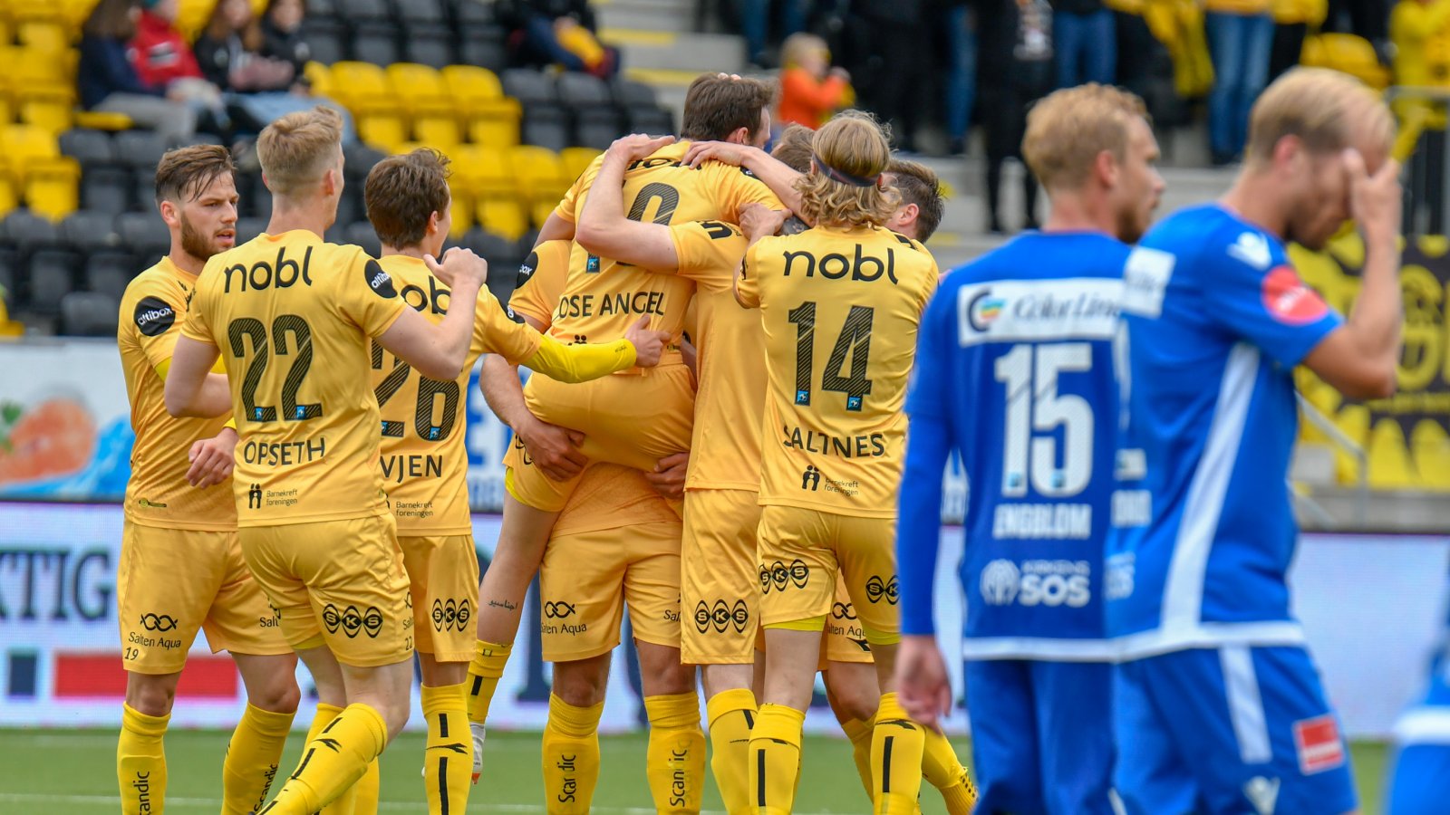 Bodø/Glimt feirer etter at José Àngel satt ballen i mål og utlignet til 1-1 i kampen mot Sandefjord.