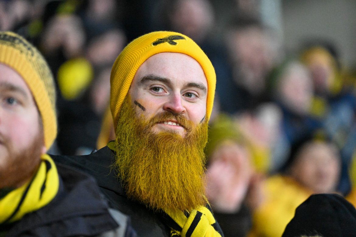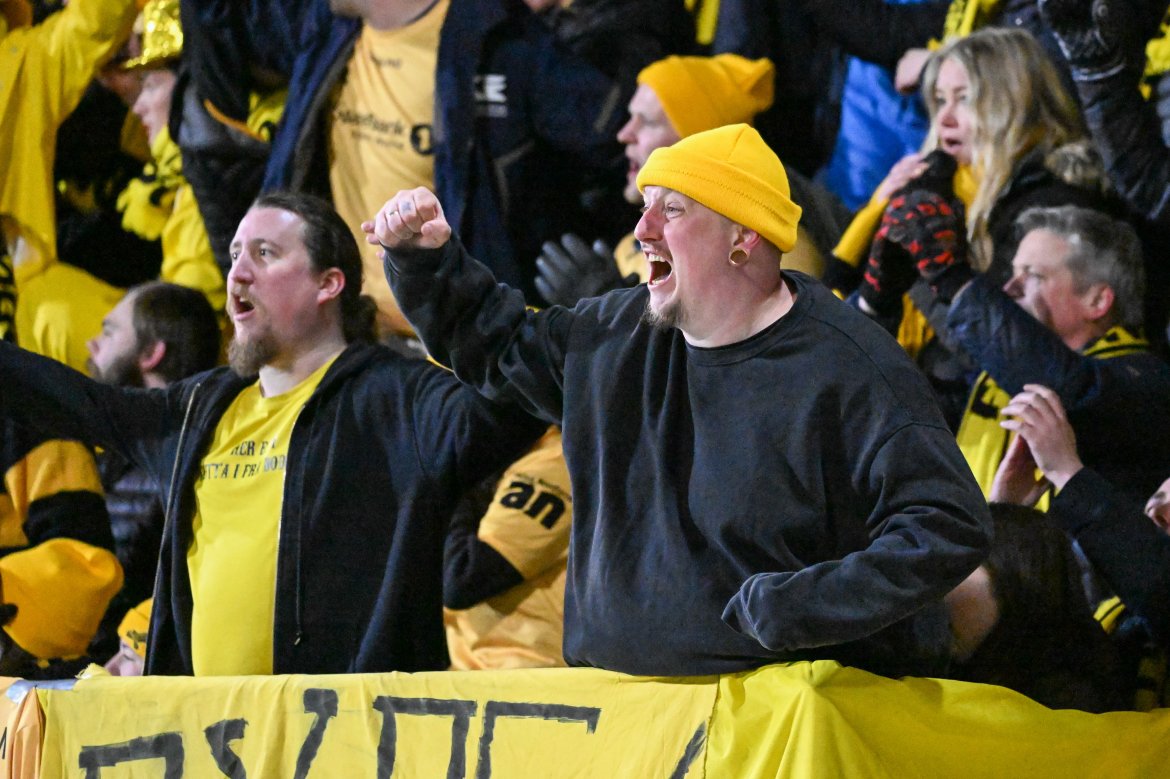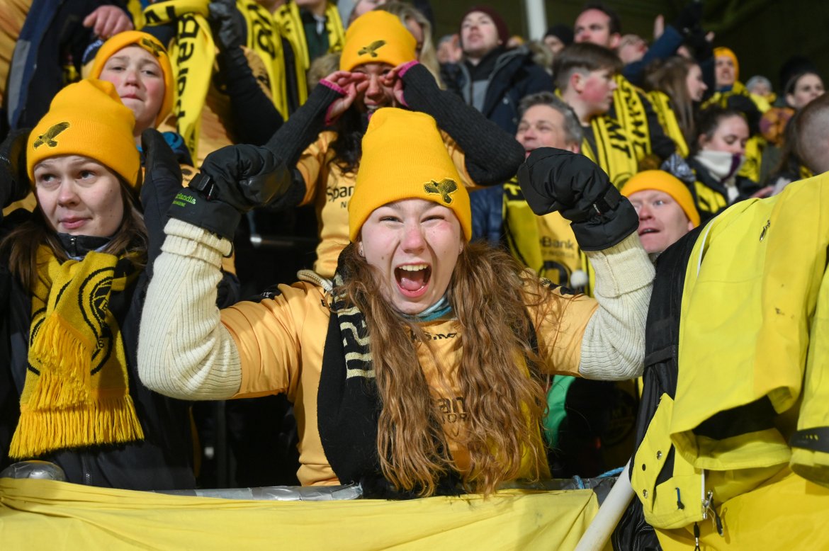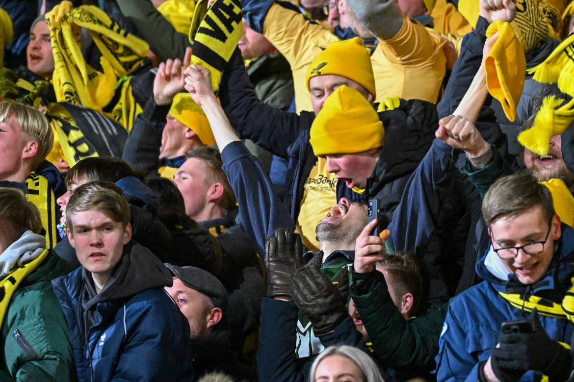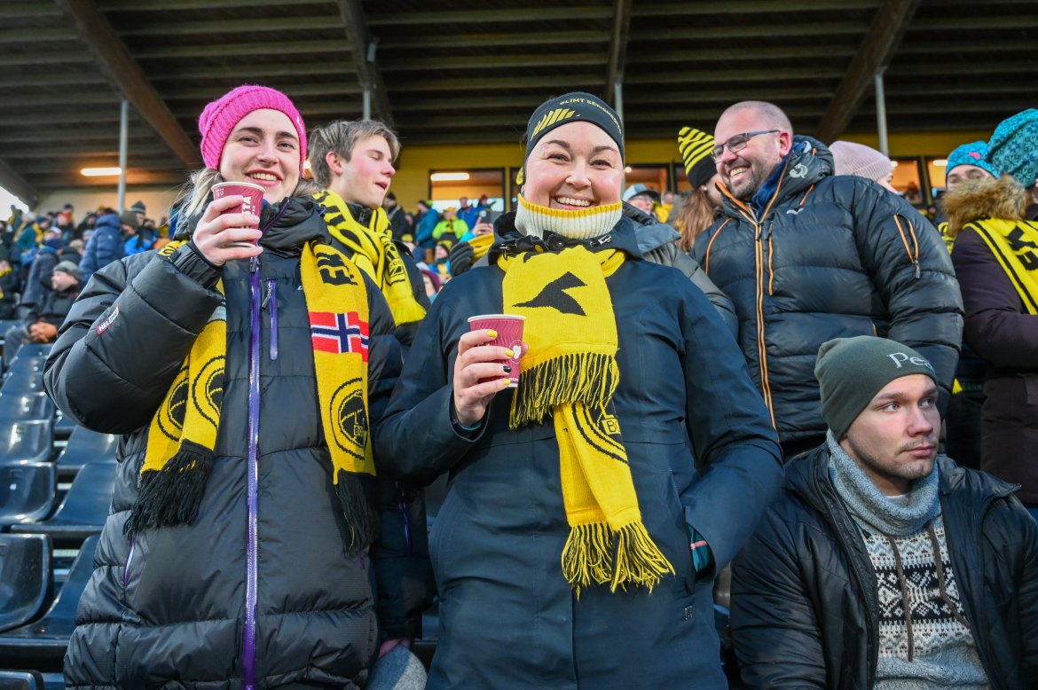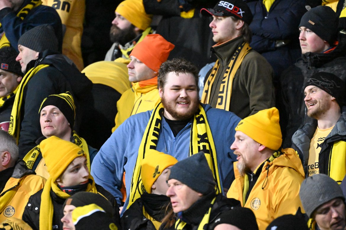 Supportere tar selfie på Aspmyra før kampen mot Roma i april 2022