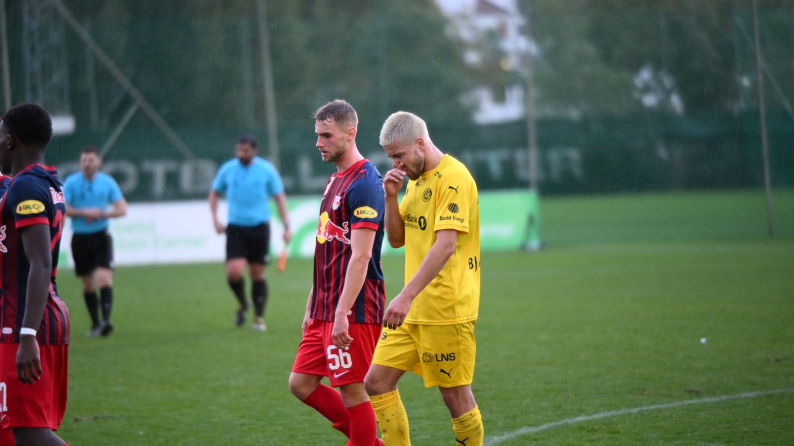 Glimt hang delvis greit med i kampen, og til pause sto det 0-1 på måltavla. Etter pause ble kampen preget av mer regnvær, mange bytter og scoringer for Salzburg.